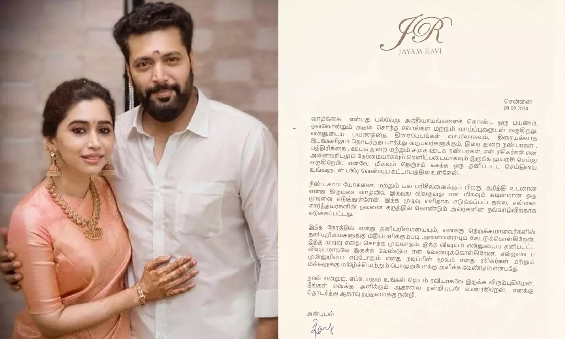 நடிகர் ஜெயம் ரவி தன்னுடைய காதல் மனைவி ஆர்த்தியை விவாகரத்து செய்துவிட்டதாக அறிக்கை மூலம் அதிகாரப்பூர்வமாக அறிவித்துள்ளார்.