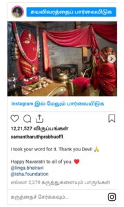 ஒவ்வொரு வருடமும் இதைப் பழக்கமாக வைத்திருக்கும் சமந்தா தனது இன்ஸ்டா பக்கத்தில் புகைப்படத்தினைப் பகிர்ந்து, “நான் உங்களது வார்த்தையை ஏற்றுக்கொள்கிறேன். நன்றி தேவி. அனைவருக்கும் மகிழ்சியான நவராத்தி வாழ்த்துகள்” எனக் கூறியுள்ளார்.
